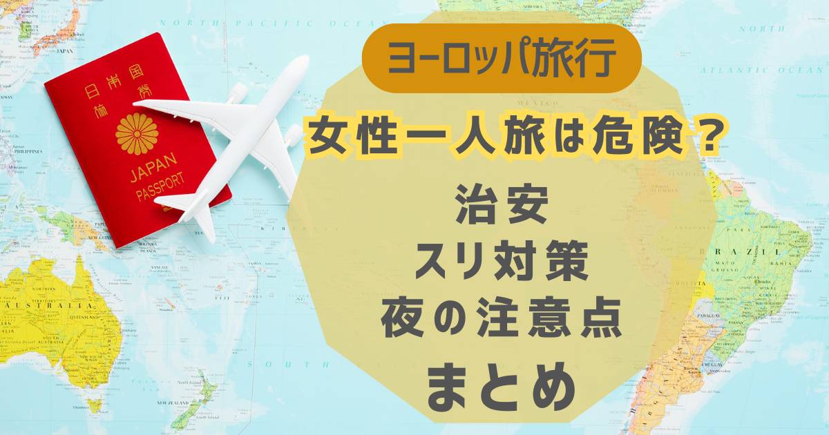ヨーロッパ、女性一人旅は危険?まず知っておきたい現実 ヨーロッパでスリや置き引きなどの軽犯罪が多いことは事実です。実際に旅行し、アジア諸国の旅行よりもう一段上の防犯意識が必要だと思いました。しかし、正しい防犯対策を知っていれば必要以上に怖... 国内